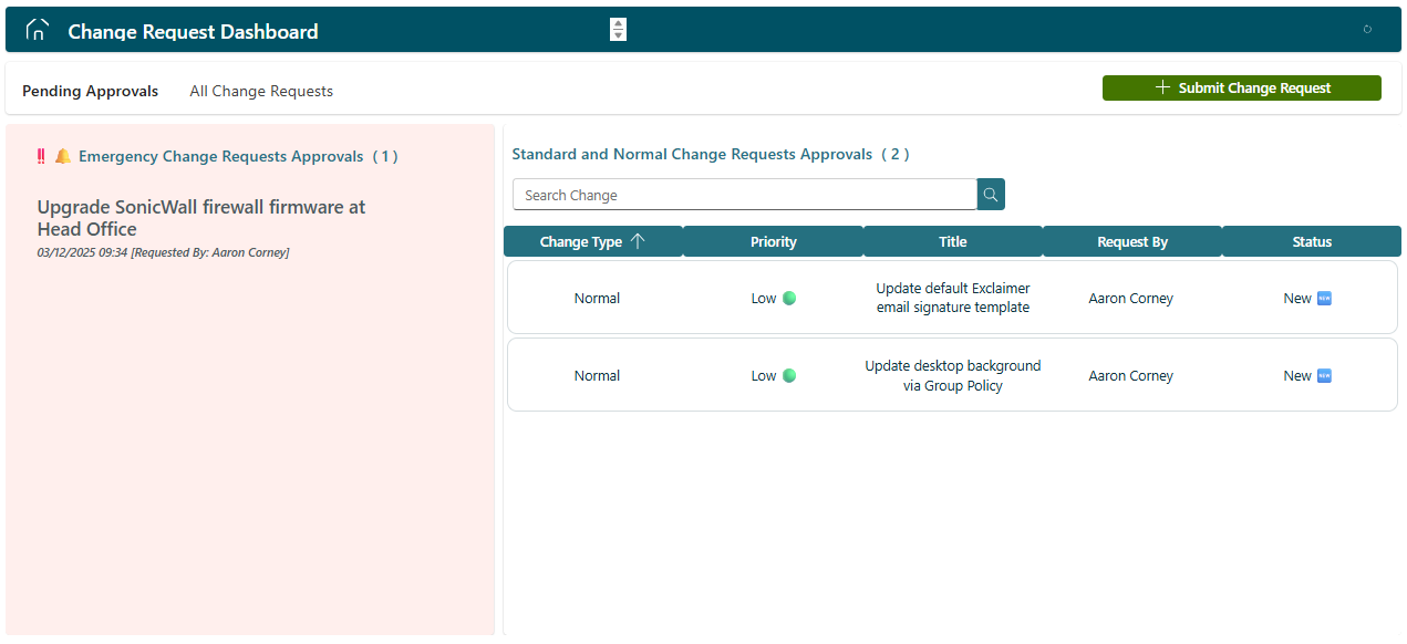- With access to the Change Request Dashboard Power App, reviewing Pending Approvals from the All Change Requests menu