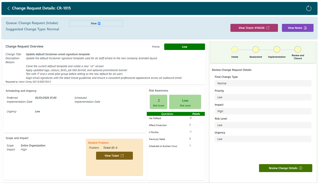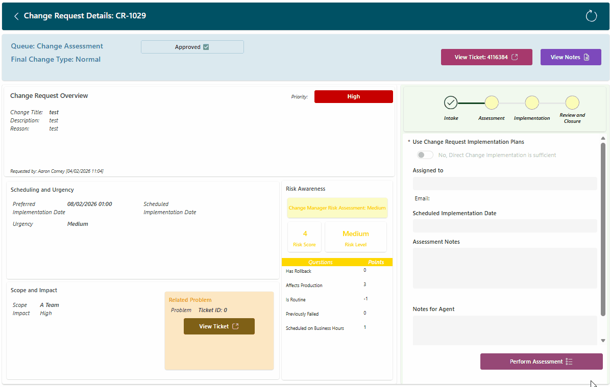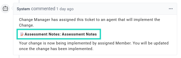 - Assessment Notes: Added to the ticket as public notes, notifying the change requester (ticket contact) accordingly
