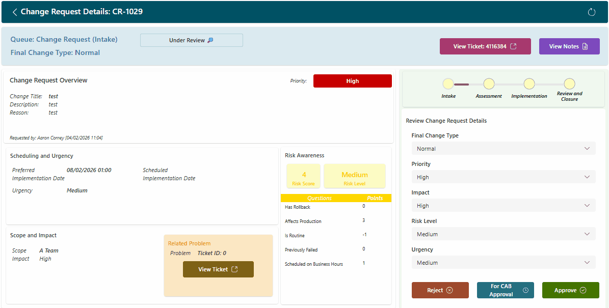 - While in the Scheduled CAB Review status, the option to Reject or Approve the change will be available: