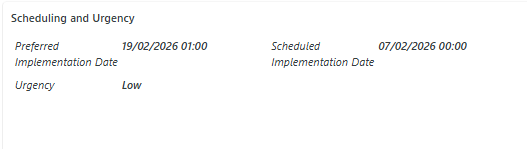 - Scheduled Implementation Date: Updates the Scheduling and Urgency module with the selected date/time value