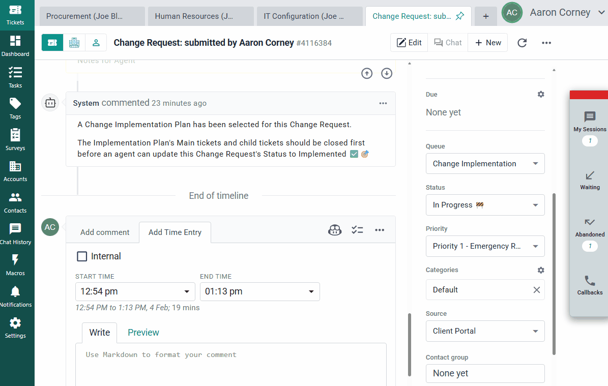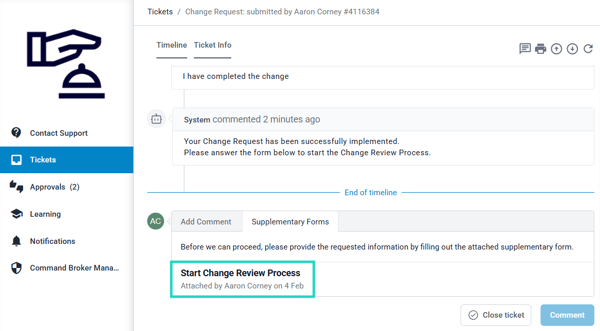 When this phase starts, a supplementary Start Change Review Process form is attached to the original change request. The change requestor will complete this form through the Client Portal, and additionally mark the ticket as closed to complete the phase: