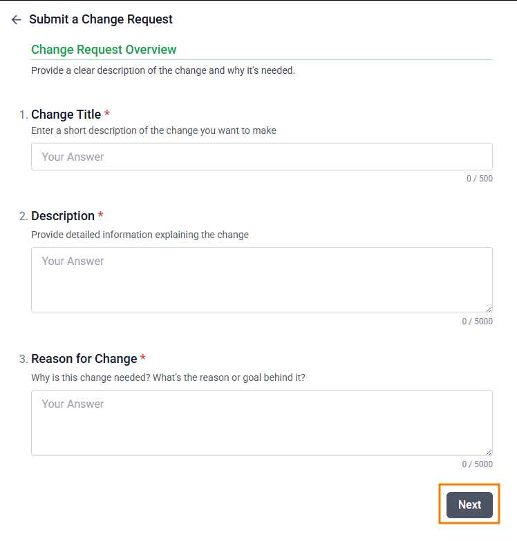 - You'll be presented with a series of pages that guide you through the required information for your change request. Select next to go through each page after adding in details: