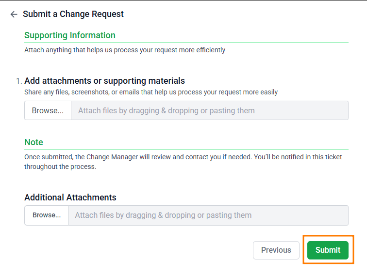 - Finally, attach any relevant files for your change control request and select Submit:
