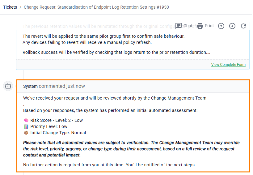 Once your request has been successfully submitted, you'll be provided with a system comment giving an overview of the risk, priority, and change type:
