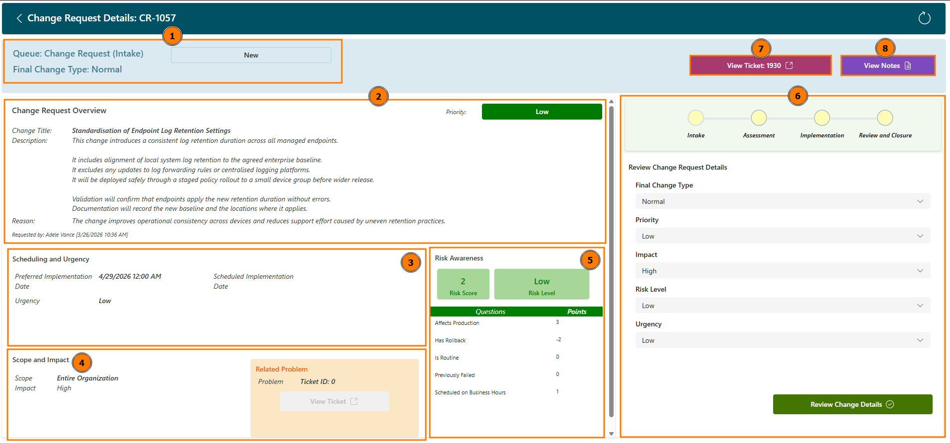 - Scheduling & Urgency: You can view the schedule and urgency for your change request.