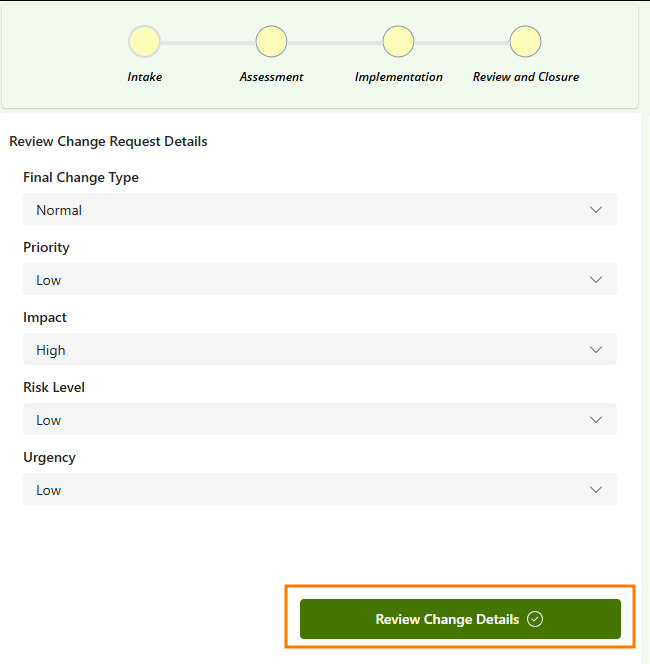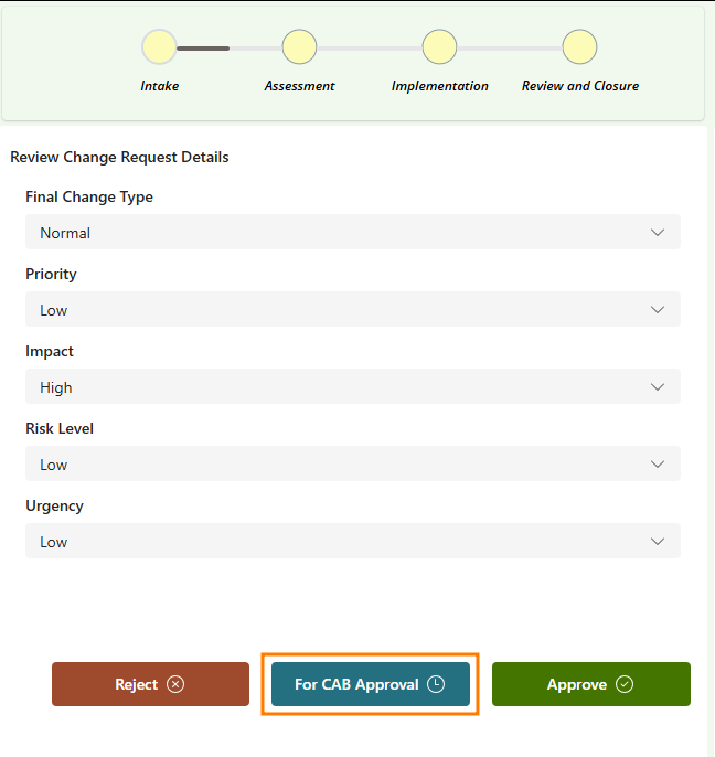 - Change Request Details: You can view and update the details for your change request (in case things change as you go through the process). Once you're happy with these, you can Review Change Details to either Reject, send For CAB Approval, or Approve the change request. (These options will automatically update the status for the ticket in DeskDirector for you.)