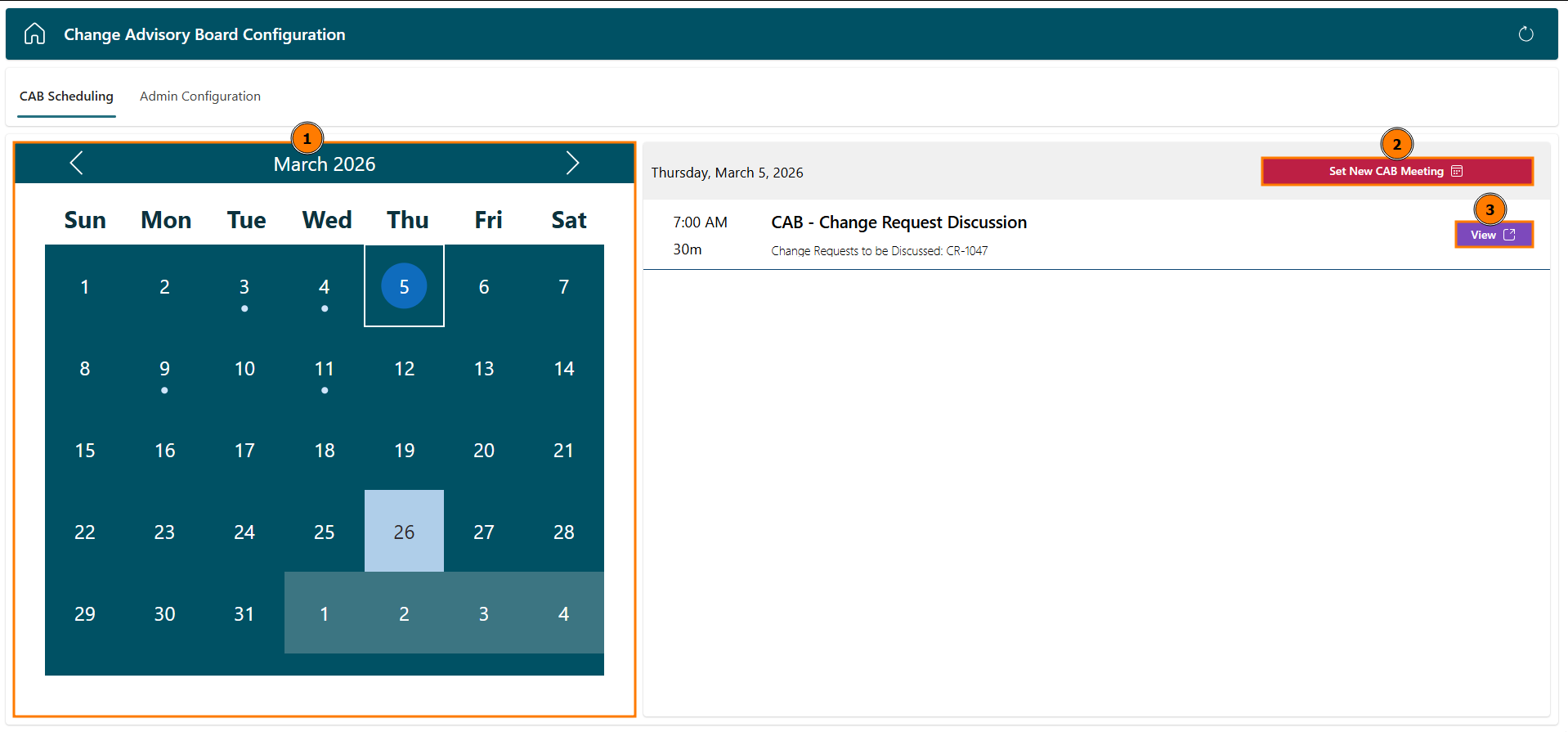 - CAB Calendar: View which days currently have CAB meetings scheduled. Here you can select a day that you want to view or add meetings to.