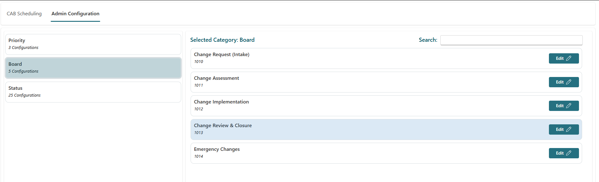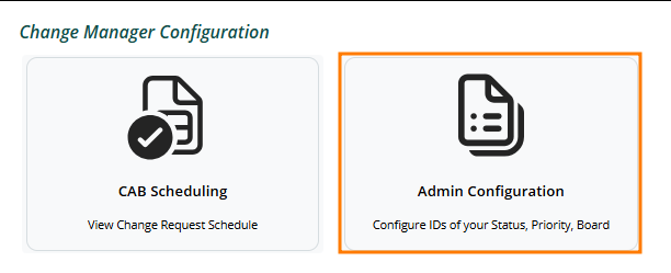 In the admin configuration area, you can configure which priorities, statuses, and boards will apply when going through the change control process: