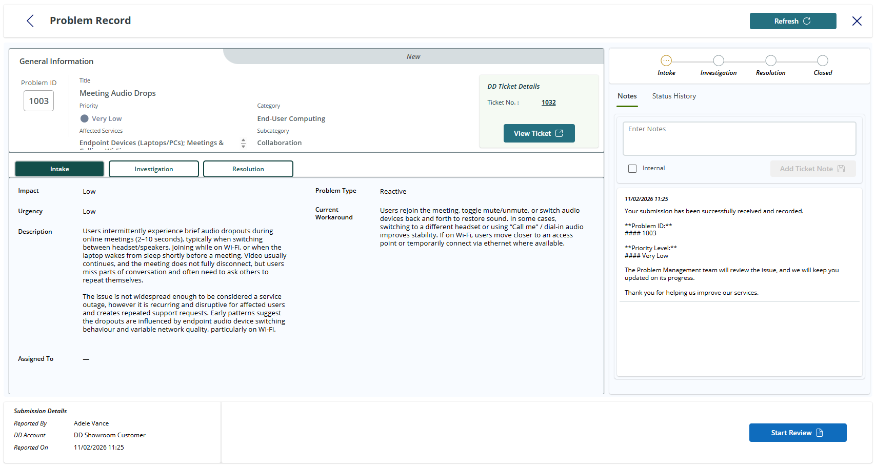 Your internal teams will leverage DeskDirector forms to submit problem records, complete with captured impact, urgency, affected services, and current workaround details to support consistent triage and classification.