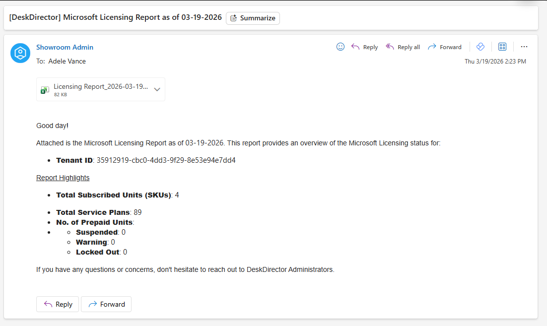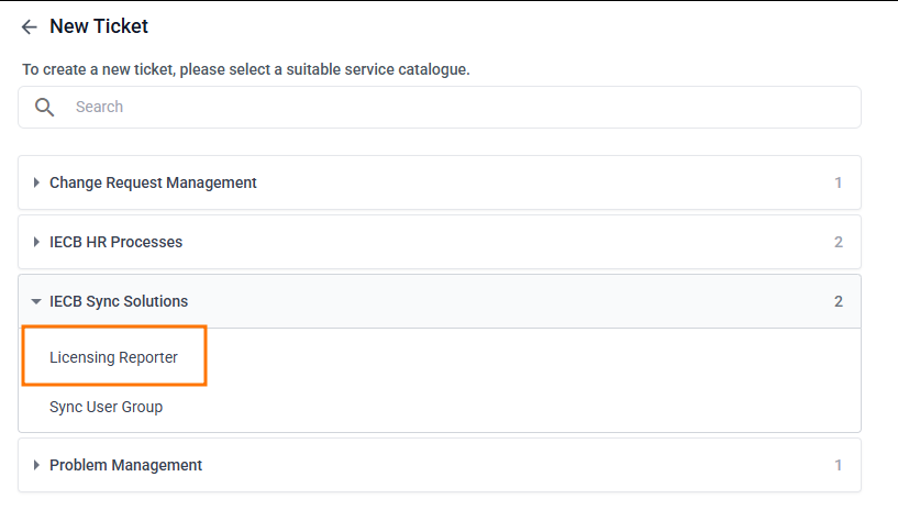 To receive a periodic report to your email inbox, you'll need to submit a Licensing Reporter request from DeskDirector. By default, this will be under the IECB Sync Solutions category when you try to raise a ticket: