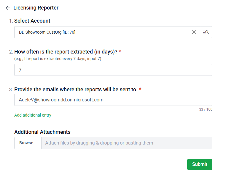 - Select your account, how often you want the report sent through, and who you want it to be sent to, then click Submit:
