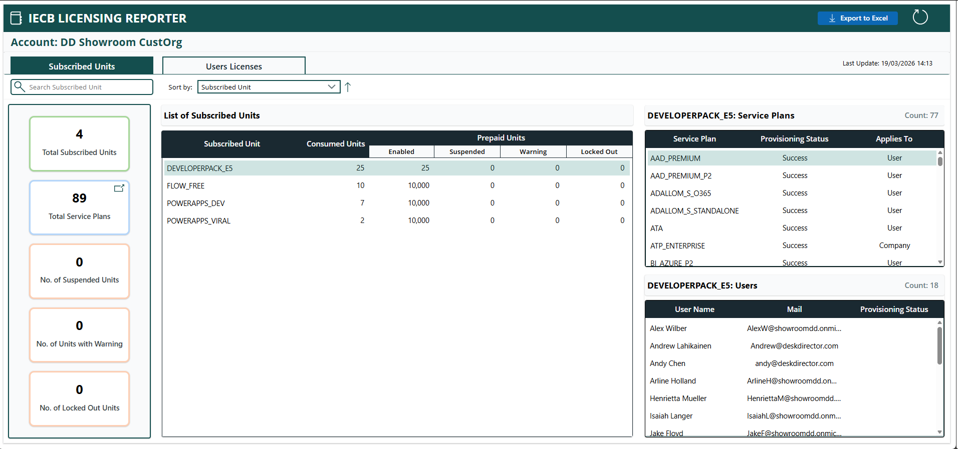 - Subscribed Units: The subscribed units tab will give you a look at all of the licenses that you currently have subscriptions for. Here you can see your totals for your units in various statuses, a full list of your subscribed units with the unit name and how many have been consumed, and a section on the right showing a breakdown of the currently selected license.